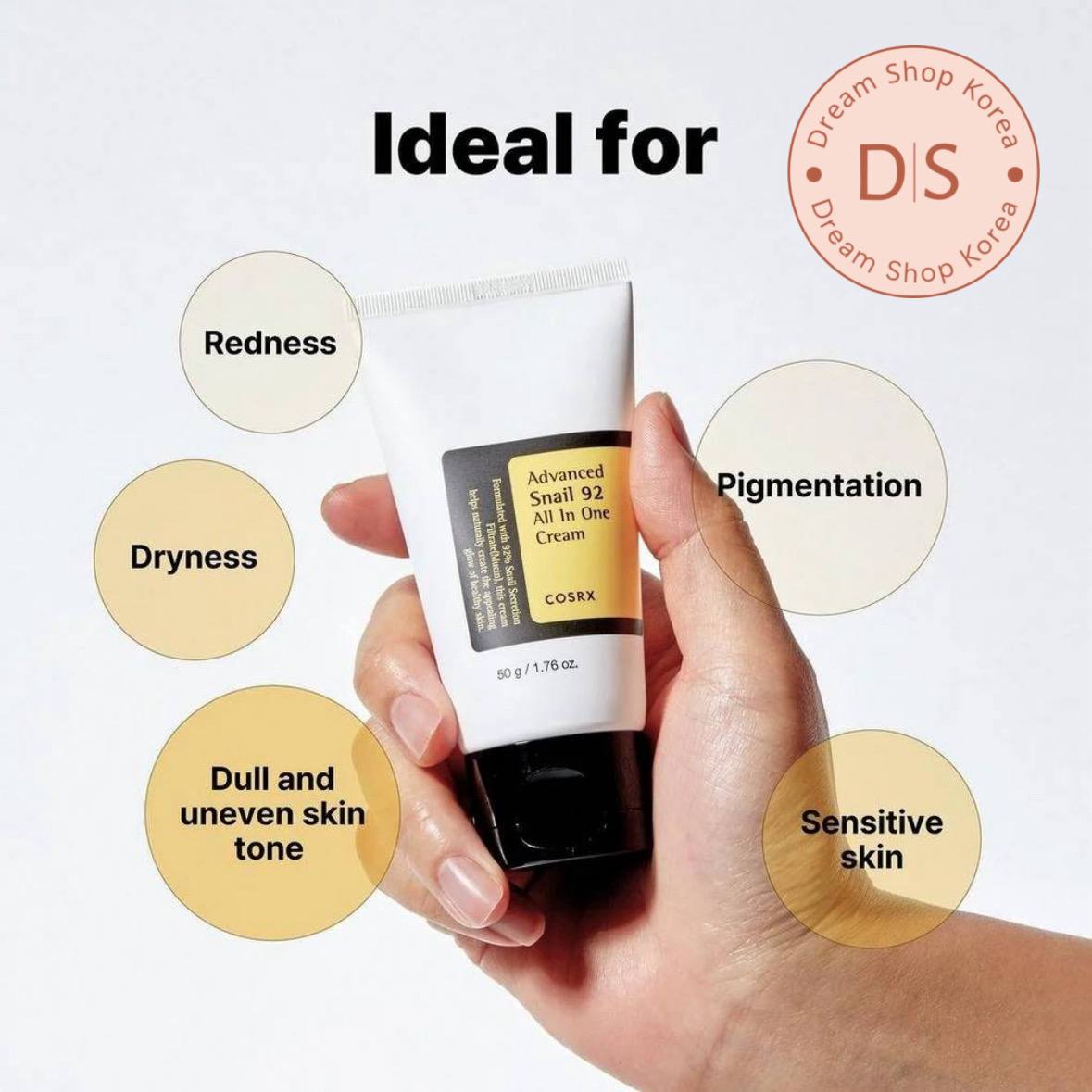 COSRX Advanced Snail 92 All In One Cream کرم چندکارهای با ۹۲٪ فیلترات ترشحات حلزون که برای ترمیم پوست آسیبدیده، کاهش قرمزی، بهبود جای جوش و آبرسانی عمقی طراحی شده. این کرم بافت سبک و ژلی داره و بدون ایجاد حس چربی یا چسبندگی، پوست رو نرم، لطیف و شفاف میکنه.🌟 ترکیبات:Snail Secretion Filtrate (92%): ترمیمکننده قوی، کمک به بازسازی جای جوش، قرمزی و یکدست شدن بافت پوستSodium Hyaluronate: آبرسانی عمقی و حفظ رطوبت پوستPanthenol (B5): تقویت سد دفاعی پوست، تسکین و ترمیمAllantoin: کاهش التهاب و حساسیتArginine: پپتاید طبیعی برای افزایش خاصیت ارتجاعی پوست☝🏻 مناسب برای:پوستهای نرمال، خشک، حساس، دهیدراته و آسیبدیده📝 نحوه استفاده:صبح و شب، بعد از تونر و سرم، مقدار مناسبی از کرم را روی پوست تمیز صورت و گردن بزنید و ماساژ دهید تا جذب شود.